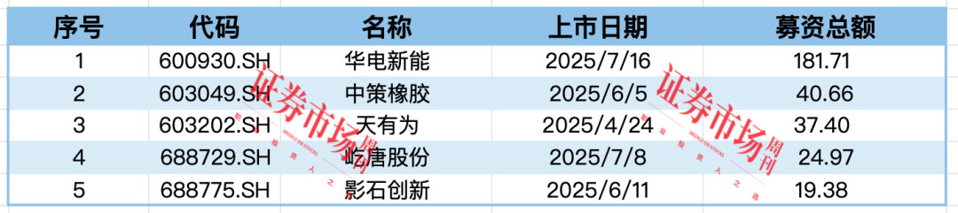 个股方面, 华电新能(600930.SH)是今年上市新股中募资金额最高的公司,其在上证主板上市,共募集资金181.71亿元, 远远超过募资排名第二位的中策橡胶,后者募资40.66亿元。